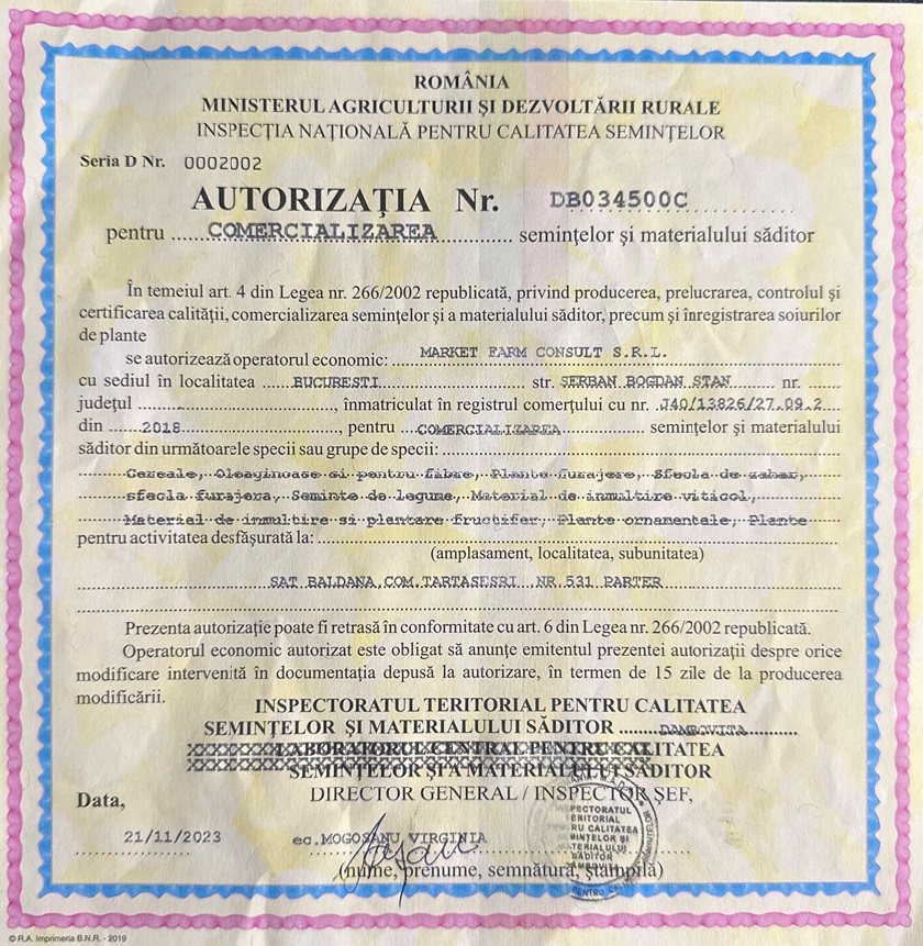 In conformitate cu legislatia in vigoare, societatea este autorizata sa comercializeze seminte si material saditor, in baza autorizatiei emise de: